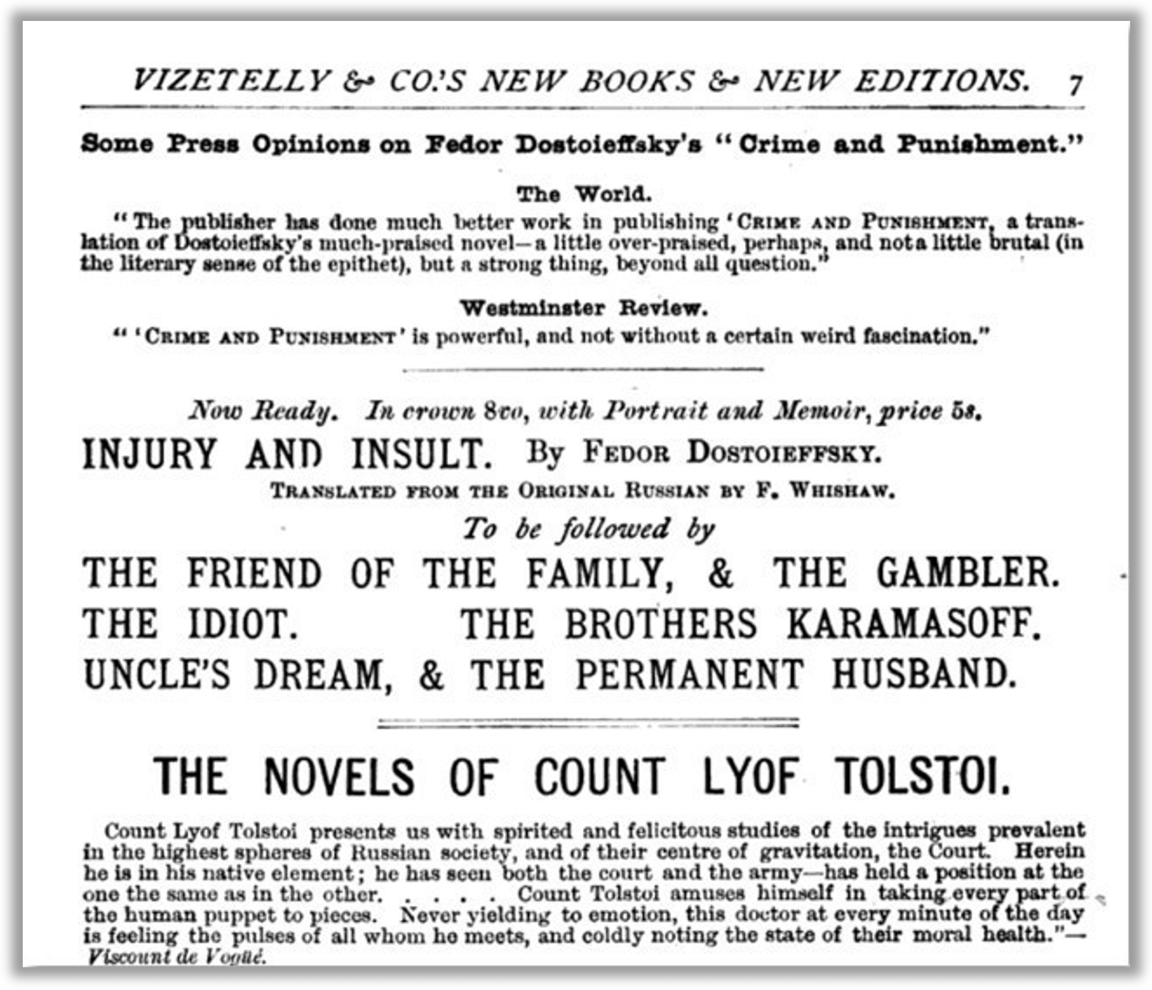 He also advertised The Brothers Karamasoff as forthcoming (see the image to the right of an ad from 1887), but the book never appeared. It became what is called in the rare book trade a “ghost book.” The premise of my novel is that the book was actually published and then suppressed, with only a single copy escaping into the world.
